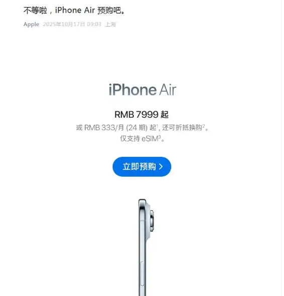 正文 iPhone Air开启预购 起售价7999元 小虾同学 V管理员 /2025-10-17/35阅读/0评论 1017 此篇文章发布距今已超过169天,您需要注意文章的内容或图片是否可用! 是的,iPhone Air国行版本已于2025年10月17日上午9点开启预购,正式发售日期为10月22日。iPhone Air提供256GB、512GB和1TB三种存储容量选择,对应价格分别为7999元、9999元和11999元。消费者可通过苹果官网、Apple Store应用程序、Apple Store天猫官方旗舰店、微信小程序中的Apple Store、抖音平台Apple Store官方旗舰店,以及中国移动、中国电信和中国联通等渠道进行预购。